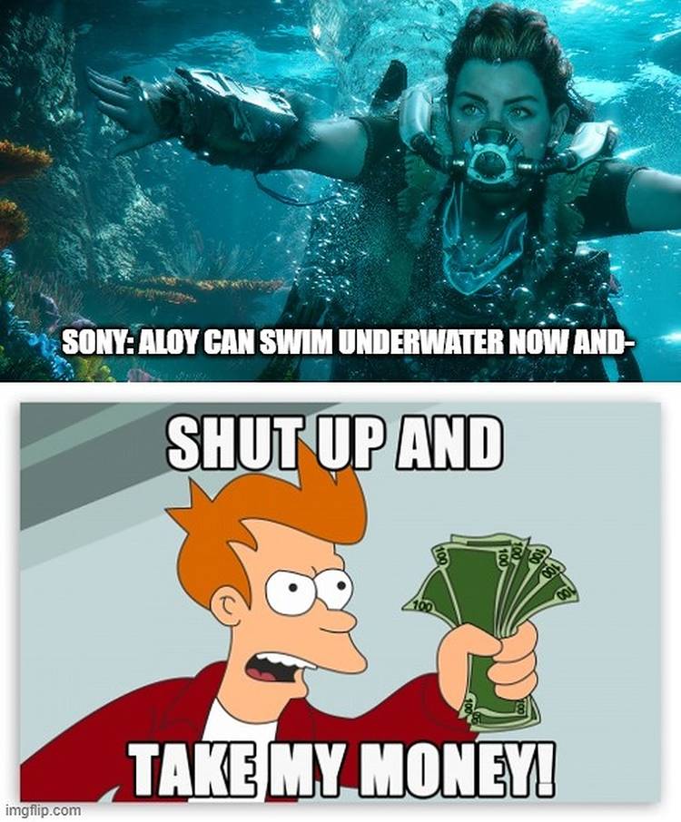 It’s best illustrated here, where the meme claims that Sony hasn’t even finished its promotion before the fan’s already forking over their cash. In all honesty, that picture of Aloy really does accomplish all the hype Forbidden West needs.