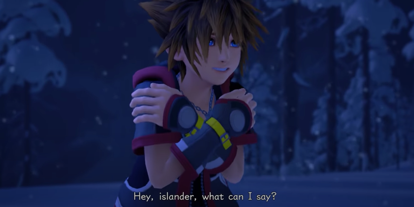 Landing in Arendelle leads to Sora immediately realizing that a snowy mountaintop is not the place to be without proper winter clothing. He begs Donald to make him a coat, to which the duck replies that his magic doesn't work that way. As he shivers and tries to warm up, Goofy remarks that the keyblade wielder must be too used to the beach.