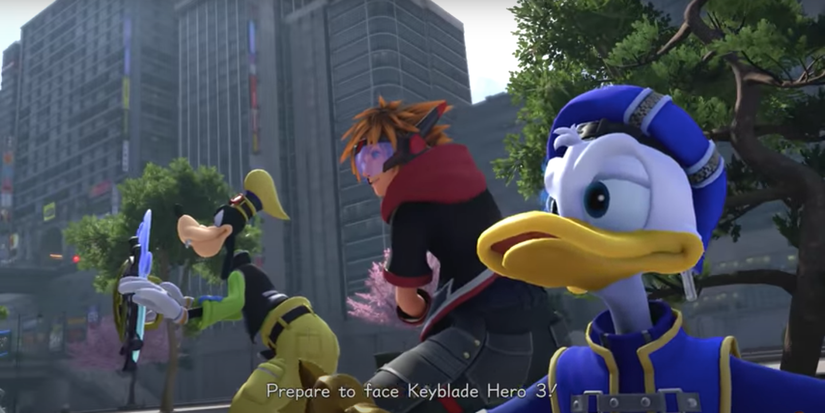 In the world of San Fransokyo, Sora, Donald, and Goofy meet the Big Hero 6 and team up with them to defeat the world's main antagonist together. Before facing off against their enemy, the three are asked for their names and group title. Inspired a little too much by the team of 6, Sora exclaims that their group name is Keyblade Hero 3. Once they head out to fight some bad guys and save the day, Sora shouts that the villain better "prepare to face Keyblade Hero 3!"