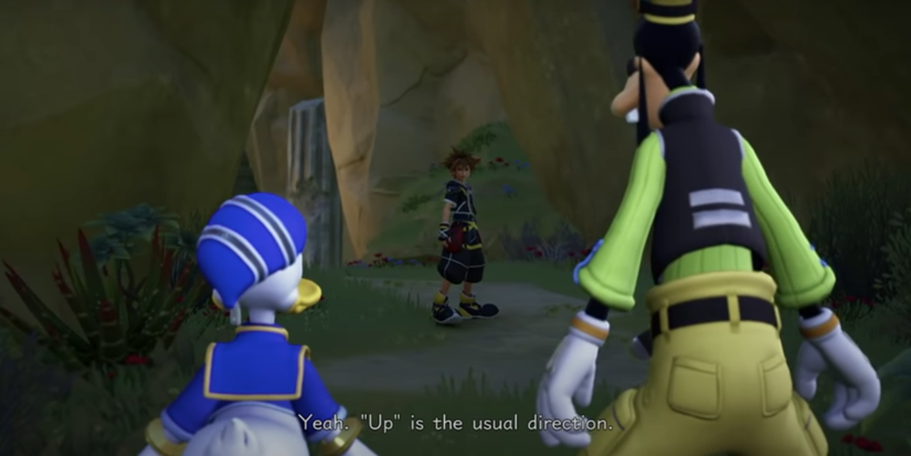 The very first world that Sora and the gang visit in Kingdom Hearts 3 is Mount Olympus. Upon arrival, the three realize that they missed the Coliseum where they usually land and ended up too far down the mountain. They figure they'll have to explore the area a bit before they find Hercules. Sora urges his friends to follow him in order to find the son of Zeus, to which Donald asks, "up the mountain?" Sora turns and cheekily replies "Yeah. "Up" is the usual direction."