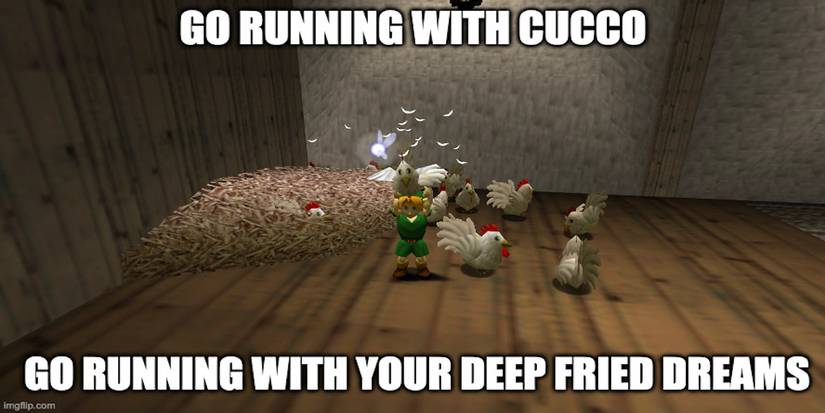 This meme is a parody of the Garfunkel & Oates song, “Running with Chicken.” That song is itself a reference to a scene in Precious wherein the titular character is running with a bucket of chicken. Speaking of, how do Cucco’s taste? No one may know in this world because as players know, attacking one will brings dozens to defend it. Killing and cooking one seems impossible. For those that haven't heard the song, it still holds up.