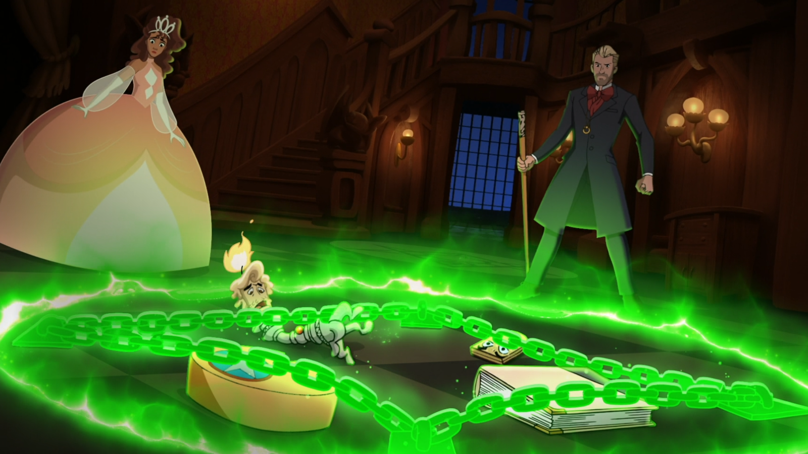 Crowley’s curse backfires on him, though, since Disney Princess’ come with their own form of empowerment. Earlier Astra had found a notebook from her mother but was unable to read the music in it. Now, the painting of Constantine tells her the song inside is spell that expunges all magic in the area, and since she’s a Disney Princess, she is able to sing it. So, Astra defeats Crowley and restores everything to the way it was, even if that includes Constantine’s own magic going away. But at least he and Astra can start at “rock bottom” together this time.