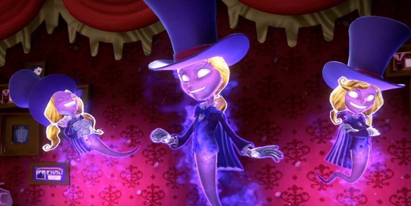 These three ladies are the bosses of the Twisted Suites, having a maze-like floor for you to traverse to reach them. They start off by hiding in their hats and throwing playing cards at you. These can be avoided just by getting out of their way. They will then spin around the arena throwing more playing cards. However, these can be knocked away or jumped over by using a Burst.