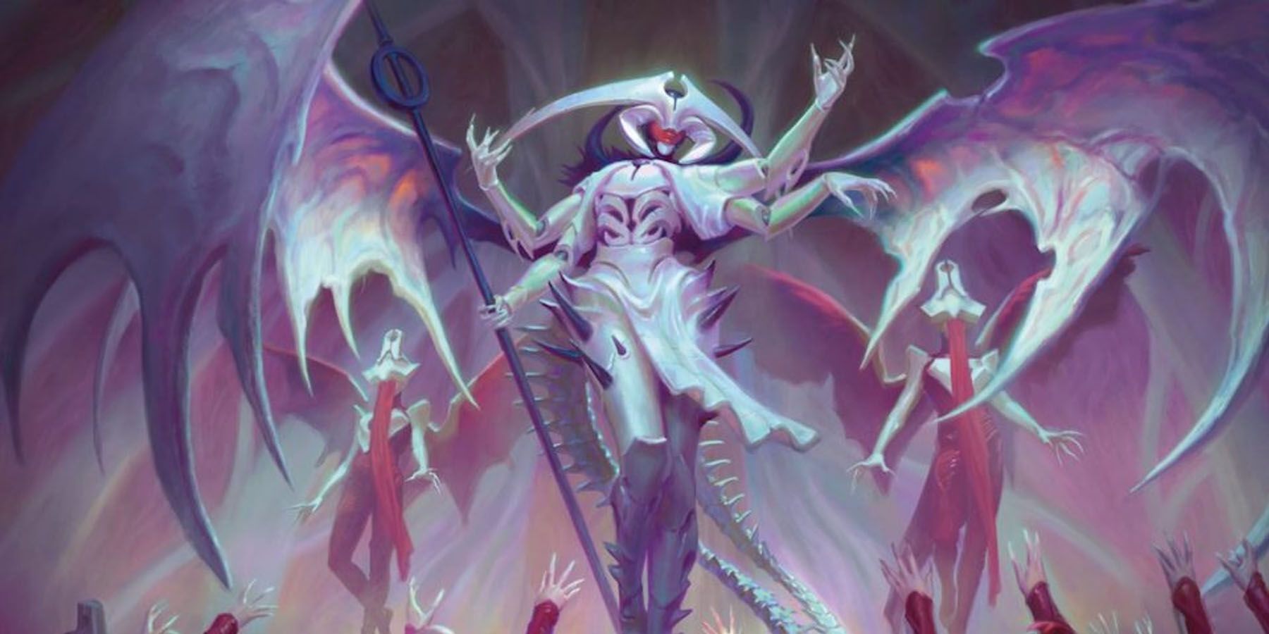 After the process of Phyrexian compleation, the angel became Atraxa and served as one of Elesh Norn’s fiercest generals. Atraxa led the efforts to assimilate the crime plane of Capenna, protected by the divine Halo that proved damaging to Phyrexians. While Atraxa’s angelic history proved resistant to the Halo’s effects, trying to corrupt the beauty-focused Maestros family made Atraxa obsessed with the same concept. With Atraxa’s newfound fascination, the Capellan crime families united to make an entire neighborhood drop on Atraxa, resulting in her death.