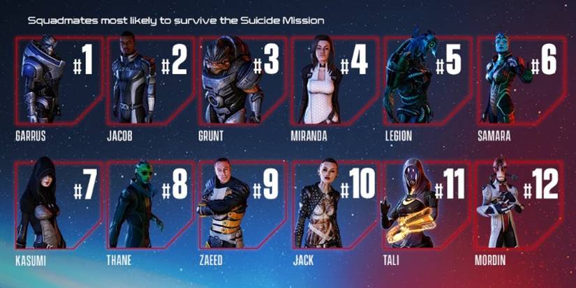 For one, beloved Salarian geneticist Mordin Solus is located directly at the bottom of the list, which is surprising considering the character has become of the franchise's most recognizable characters. He's followed by an equally popular hero in Tali, who is one of only two squad members that teams with Shepard in all three Mass Effect games.
