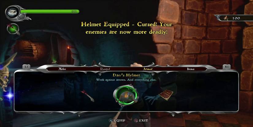 What does the item do? It makes the game a heck of a lot harder, that’s what it does. Equipping it changes Dan’s look (of course), but the game also gives the player a warning prompt that the item is cursed. While Dan’s wearing the helmet, he takes double damage from enemies, which can be very problematic for those unaccustomed with the sometimes-finicky nature of MediEvil’s combat and controls. If the camera decides not to cooperate at the wrong moment, you can easily blunder into newly-spawned enemies that shred through your health. It’s a great optional challenge, yes, but you’ll want to be very, very careful with it.