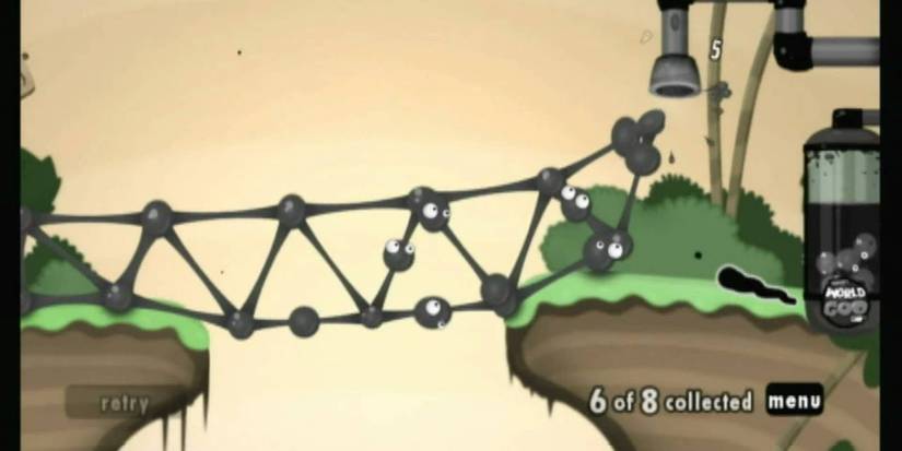 World of Goo is a game centered completely around slimy goos and using them to create structures and move through levels. There are many types of goos and each has a different function. Black Goos are the standard building blocks with two legs. White Goos are similar to the black ones, but with four legs and less adjustability to allow for more stability. Green Goos can be detached and reattached from other goos. Water Goos can only attach in one location which is ideal for building downward.
