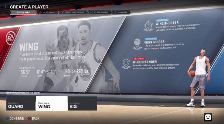 The first big decision to make is choosing between three broad player archetypes; guard, wing, and big. From here, players select a more specialized role — for instance, a guard can opt for a point shooter playstyle in the vein of Steph Curry, or to be a slasher along the lines of Russell Westbrook.