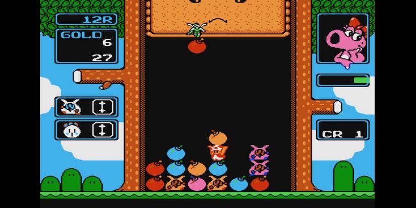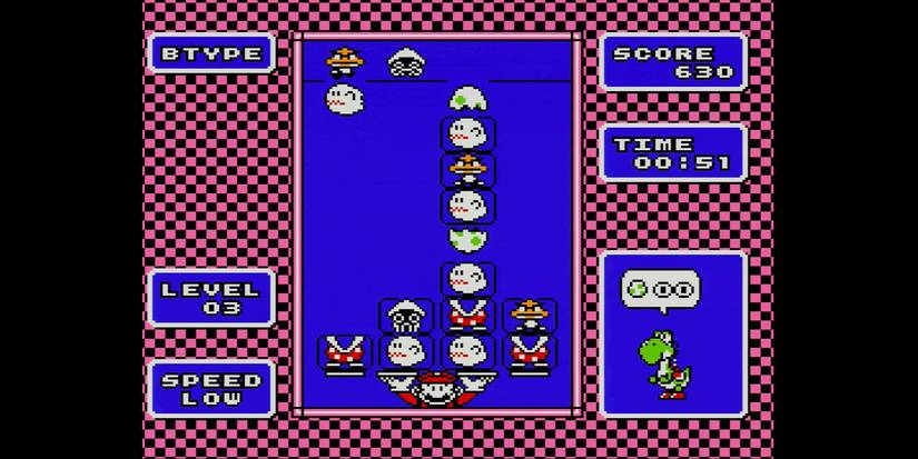 In Yoshi, the player controls Mario, who is at the bottom of the screen beneath four plates. The player can have Mario switch the position of two adjacent plates. From the top of the play area drop various familiar characters from the Mario games; like goombas and piranha plants. Stacking two of the same type of creature on top of each other causes them to disappear. In addition to these creatures, parts of eggshells will also drop down from above. The player must try to trap as many creatures between two falling pieces of eggshell for bonus points. This game gets really fun when played cooperatively with a friend.