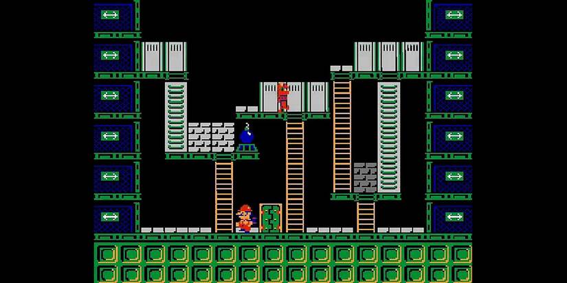 The difficulty comes from the enemies that run around the levels trying to catch Mario. The levels have wrapping edges – meaning if Mario runs off one side of the level he will appear on the opposite side. Scattered around are bombs and barrels that Mario can use to temporarily remove some enemies from the level.