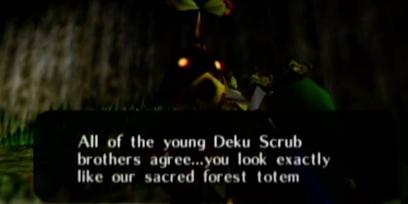 Then, go back with the Skull Mask to get a Deku Stick upgrade. This time, the little creatures flock to Link like he's a magnet, and their leader claims that Link looks like their secret forest totem. Sweet! That's better for the self-esteem. Keep in mind that waiting too long to play this game will result in losing the upgrades. Instead of upgrades, the Scrubs will simply give Link rupees.
