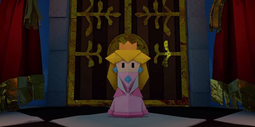 The trailer begins as a tall double door eerily opens up and an origami Princess Peach slowly walks out to greet our hero. She says how nice it is to see him and then asks "will you crease yourself and be reborn, like me?" When Mario says no, Peach says that his replies are "all paper-thin" and opens a trapdoor beneath him. By this scene, it could be assumed that, in addition to being turned into origami, those turned by King Olly seem to be brainwashed into thinking that the king has saved them by turning them into these new forms.