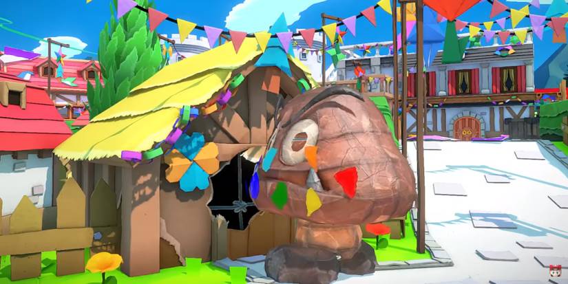 Along with all of the origami enemies, and apparently one giant yarn enemy, there also seem to be some odes to paper mache placed sporadically in this game. One of the first enemies you see in the trailer is a giant paper mache Goomba eating something out of a home. At the end of the trailer, you see Mario put on the paper mache head of Samus of Metroid and pretend to shoot at things, along with Goomba and Donkey Kong paper mache heads on the side.