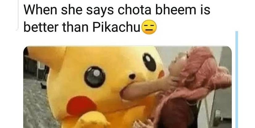 Ok, to clear this up, pretty much nobody knows what chota bheem is and neither do we, but the statement right here still stands. How dare anyone say anything, especially something that most people don't even know about is better than the mascot for a majority of 2000s kids' childhoods. Seriously the fury of this Pikachu mascot is amazing though, imagine how mad you have to be to go through the effort of sliding your arm through your only air hole.
