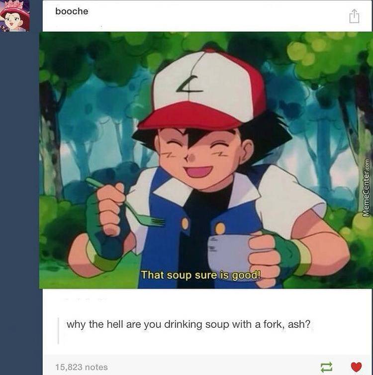 The dining scenes in Pokémon always seem reminiscent of TV shows like The Big Bang Theory, where it’s painfully obvious the actors aren’t really eating the food. In the same vein, Ash and his pals always seem to be pretending to eat even though they’re animated characters.