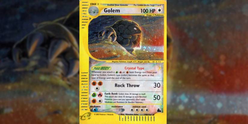 Golem from the Skyridge set is a bit more useable, though not by much. Its Rock Throw is as generic as TCG attacks come, though at least its energy cost is not ridiculous. Golem's Earth Bomb attack, however, is a risky move to use as it is uniquely designed to injure friends as well as foes.
