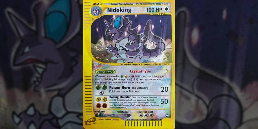 Nidoking from the Aquapolis set actually has two good attacks, both of which are useful in different situations that give this Stage 2 Pokemon some versatility. Nidoking's Poison Horn may be a bit high-cost, though making the adversary Poisoned will eventually pay off if the foe does not heal and remove this special condition.