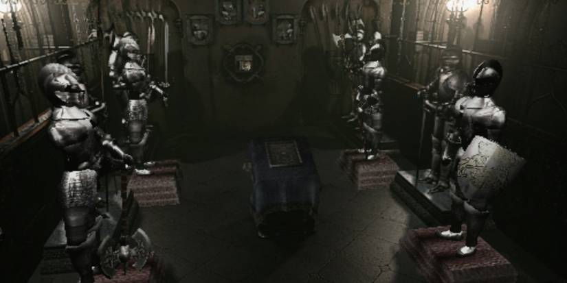 Resident Evil Remake retains the core experience while adding to it in ways that legitimately improve the gameplay and story experience. However, Resident Evil Remake also remixes some of the classic puzzles from the game. One of the more difficult examples is the puzzle that utilizes four Knight statues, each one with a different weapon symbol.