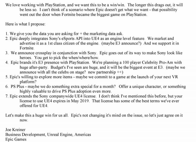 Epic Games threw out seven distinct ideas to sweeten the pot for PlayStation enabling crossplay, offering to brand its E3 presence with PlayStation, exclusive skins for PlayStation Plus subscribers, and to hail PlayStation as the heroes of crossplay, but Sony declined according to leaked emails.
