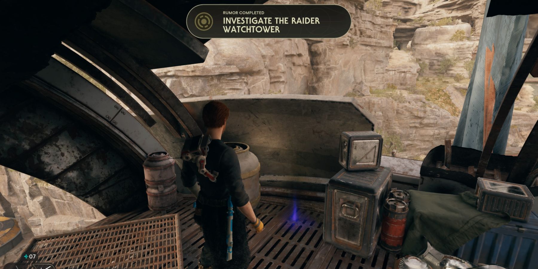 Instead of heading straight toward the Raider Watchtower, Cal must travel up the hill on the right and run across the wall at the end of the path to jump to the Riverbed Watch Meditation Point. There, a shortcut back to the ground can be created by cutting the rope overlooking the area below. Just right of the door leading inside, BD-1 can scan the A Warlord's Standard Data Entry.