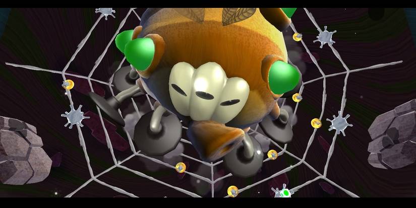 Mario fights this spider in Space Junk Galaxy, using a new mechanic that allows the plumber to fling off sticky webs to reach new places. The boss constantly spins, shooting green poison from its mouth in the hopes to hit him.