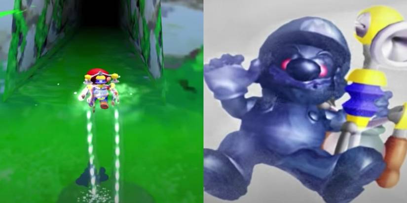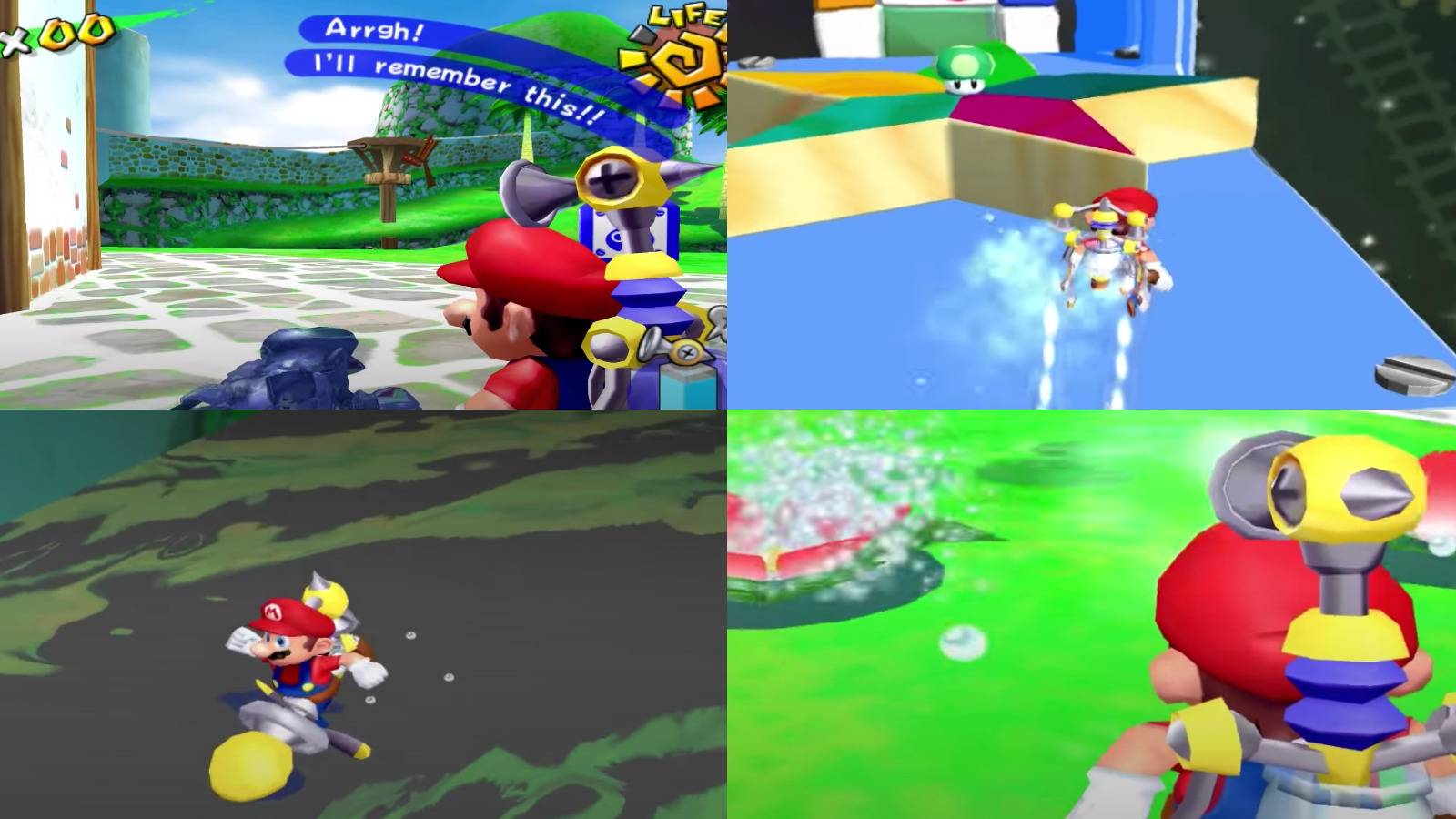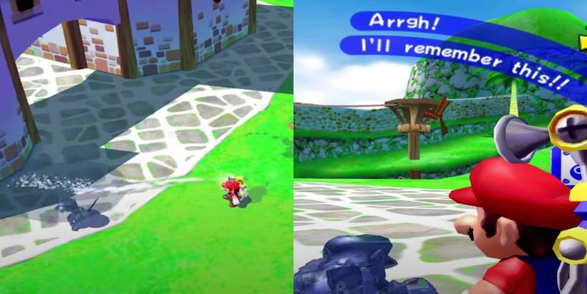 Shadow Mario is running wild and free this time. As usual, Mario must chase the guy down and spray him with FLUUD. After spraying him so many times, he will give up and express his frustration. Shadow Mario isn't too threatening though, so there's really nothing to be afraid of.