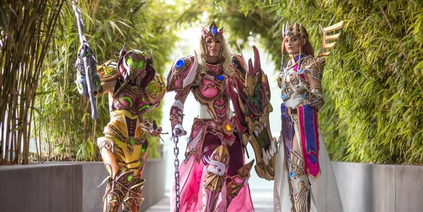 These gorgeous characters are Samus from Metroid, Peach from the Mario series, and Zelda from The Legend of Zelda. They are in the style of the Diablo games, with the pointy weapons and armor. Samus is cosplayed by Danielle Beaulieu, Peach by Jessica Nigri, and Zelda by Friscoblondie. The colors are fantastic, and Peach's Bowser shield is something very special. It really makes us wish these cosplays could be used in a real Nintendo game.