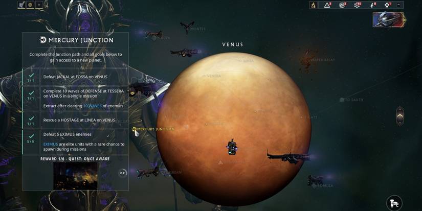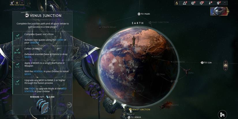 Completing "Vor's Prize" should complete most of the requirements for the Earth to Venus Junction, but there might still be categories the player hasn't fulfilled. To battle the boss inside the Junction, players will need to complete "Vor's Prize," collect 20 Mods, apply 4 Mods to a single Warframe or weapon, and rank up any mod to rank 2 or higher.