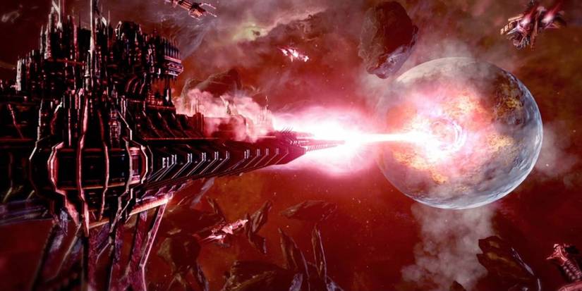 The World Engine is a planet-sized structure, housing a massive Gauss Weapon on its equator that can eliminate ships in a single blast. Moreover, hundreds of Night Scythes and Doom Scythes protect the ship from outside forces. Lastly, it possesses a defensive screen that interferes with both remote and electronic devices, as well as powerful energy shields.