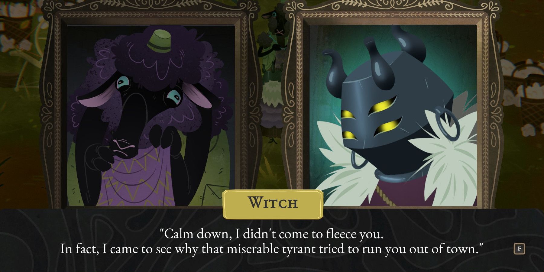 Wytchwood is a story about a witch, forced to help a variety of odd NPCs through a contract with a goat. In this indie game, she travels around a fairytale world, mixing spells to help those she finds in need. One of the many characters a player helps on this journey is the Black Sheep.