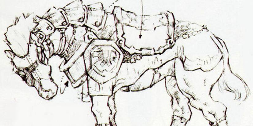 Although not a large presence in-game (only appearing in two cutscenes,) Ganondorf's horse gets a detailed piece of concept art– something not even Epona has. This might be because Epona's design was finalized early, but it's still worth noting. This could suggest Ganondorf was once intended to play a larger role in the plot, but it's unlikely he already appears quite frequently compared to other villains in the series, especially up to that point. Worth noting is the shield on the horse's armor, featuring an unfamiliar symbol.