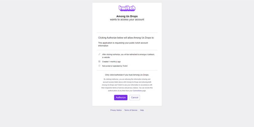 After clicking on the Twitch icon, users will be directed to log in to Twitch and authorize Among Us Drops.