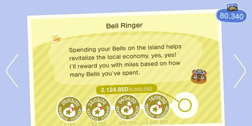 Bell Ringer is a task that requires the player to spend bells (the game's main currency) at Nook's Cranny (or to the Nooklings if Nook's Cranny has not yet been unlocked). The rewards for this task are 300, 500, 1000, 2000, and 3000 Miles, in the order of ascending difficulty.
