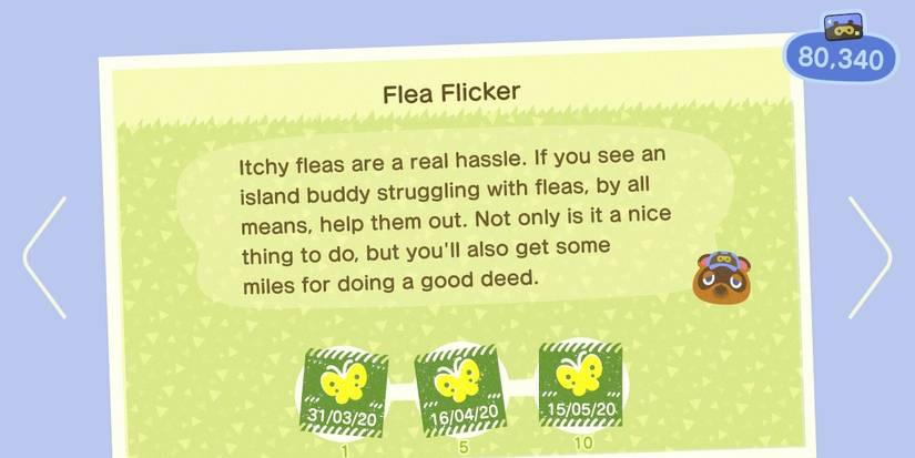 Flea Flicker is a task that requires the player to catch the fleas that can occasionally be seen jumping around on the island's villagers (this can be done with a net, like any other bug). The rewards for this task are 300, 500, and 1000 Miles per level.