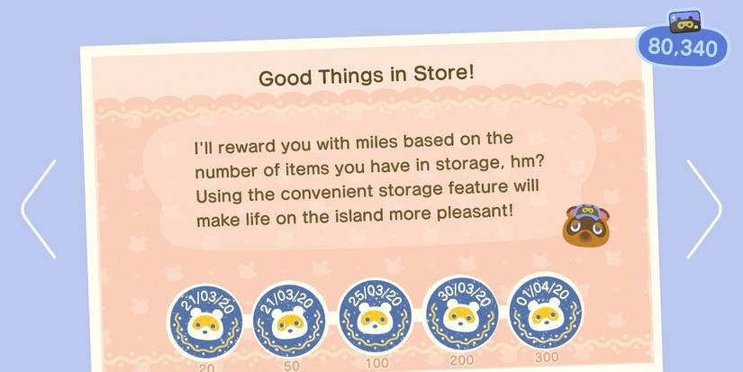 Good Things in Store tasks the player with storing items inside of their house's built-in storage space (automatically installed in any house and increases in size as the house is upgraded). The rewards for this task are 300, 500, 2000, 3000, and 5000 Miles, in order.