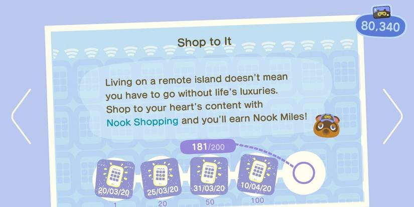 Shop to It is a task that requires the player to purchase items from the Nook Shopping service (available on the ABD or Nookphone after 100 items are purchased). The rewards for this task are 300, 500, 1000, 2000, and 3000 Miles per level.