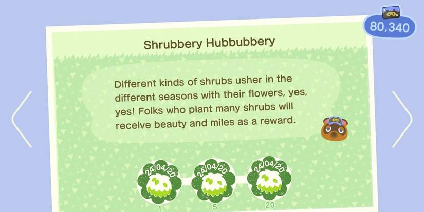 Shrubbery Hubbubbery is a task that requires the player to plant shrubs on the island (a feature introduced in the Nature Day update). The rewards for this task are 300, 500, and 1000 Miles, in their respective order.