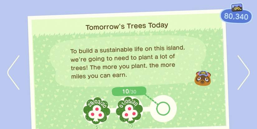 Tomorrow's Trees Today is a task that requires the player to plant trees on their island. The rewards for this task are 300, 500, and 1000 Miles, in ascending order.