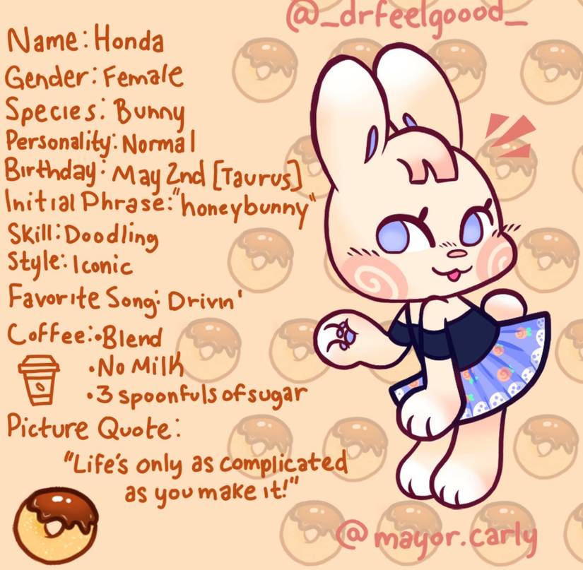 Honda is a bunny with a love for doodling—maybe she'd be good friends with Milly. She has a normal personality, which means that she's nice to players and tends to have a middle-of-the-road opinion on things. This bunny is a music lover, as well, with her favorite track being Drivin.'