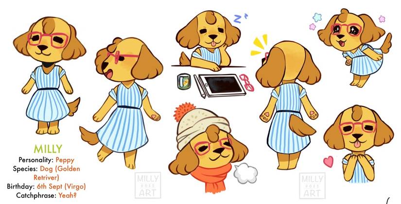 On September sixth, Milly the golden retriever was born. As her illustrations show, she wears a lovely striped blue dress and enjoys drawing on an iPad-like device. Her catchphrase is "yeah?," so, if she ever did make it into the game, that's how she'd finish her sentences.