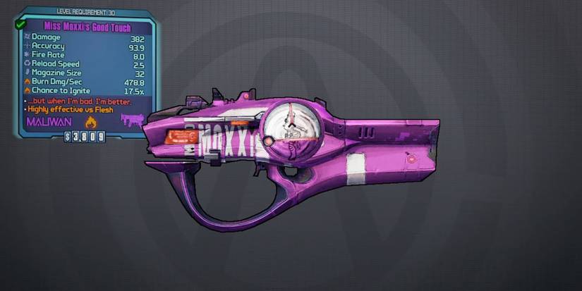 Given Moxxi’s business dealings and numerous lovers there are a large number of items found in the games that once belonged to her. At least a dozen items can have the special prefix ‘Miss Moxxi’s’. The items range from weapons to artificacts, but they all share the same characteristic of providing health to the wielder when causing damage.