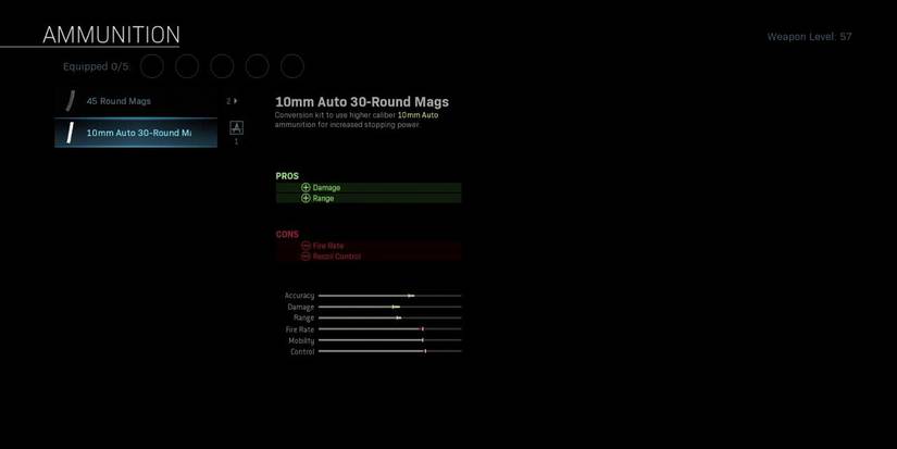 Available only for the MP5, the 10MM Auto 30-Round Mags increases the damage and range of the weapon, while decreasing both the fire rate and the recoil control. While it's definitely not ideal to run around with a weapon that only has 30 rounds in the magazine, the payoff of the extra damage and range here is worth it, provided you aren't trying to fight an entire team at the same time.