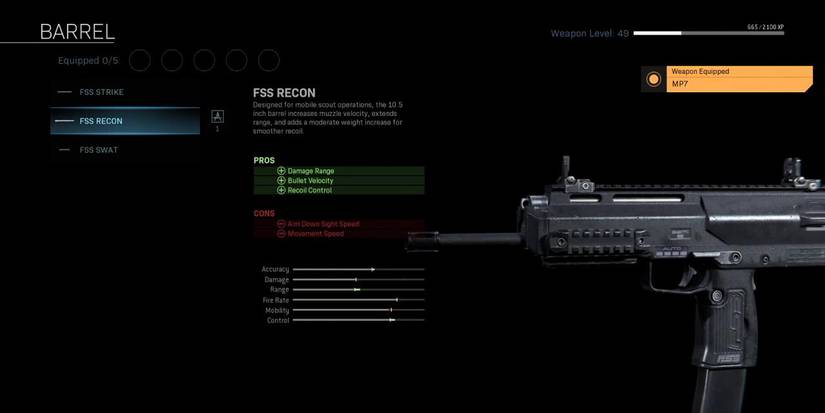 The FSS RECON isn't available for every SMG, but it is at least available for the MP7. While the MP7 isn't necessarily the absolute best SMG out there, it's definitely up there, so this weapon attachment makes it onto the list. The FSS RECON adds some extra damage range, bullet velocity, and recoil control, at the cost of some ADS speed and movement speed.