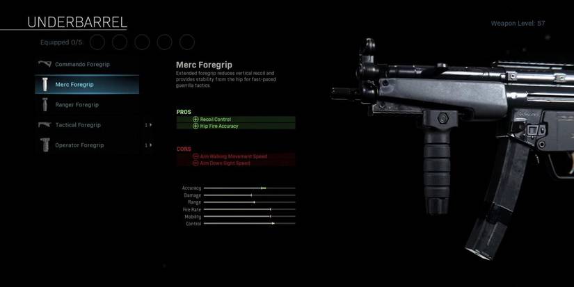 The second grip on this list, the Merc Foregrip increases both the recoil control and hip-fire accuracy of your weapon, at the cost of aim walking movement speed and ADS speed. Many who play with SMGs find themselves in close enough range that hip-firing is perfectly viable, and if you're one of those people, the Merc Foregrip is probably the choice for you.