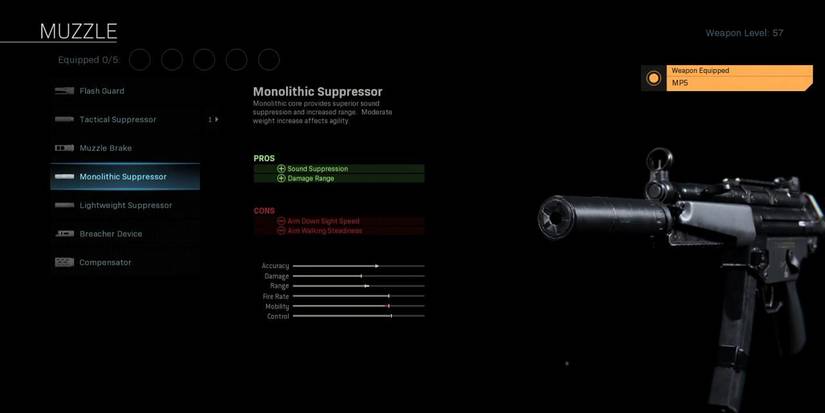 The Monolithic Suppressor dampens the sound of your weapon firing, keeping you off the radar, and increases the damage range of your weapon at the same time. This can make a really big difference on an SMG which doesn't have an overabundance of range from the get-go, and all this at the low-low price of slightly worse ADS (aim down sights) speed and aim walking steadiness? It's worth it.