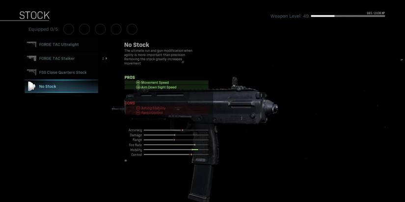 Only for those that prefer the most aggressive, strike-fear-in-your-enemies approach, taking the stock entirely off of your weapon increases your movement speed and ADS speed, at the cost of some aiming stability and recoil control. If you're utilizing this kind of playstyle, chances are you're going to be close enough to your enemy that the extra weapon control isn't going to be an issue, so the tradeoff here is more then worth it, in the right situation.
