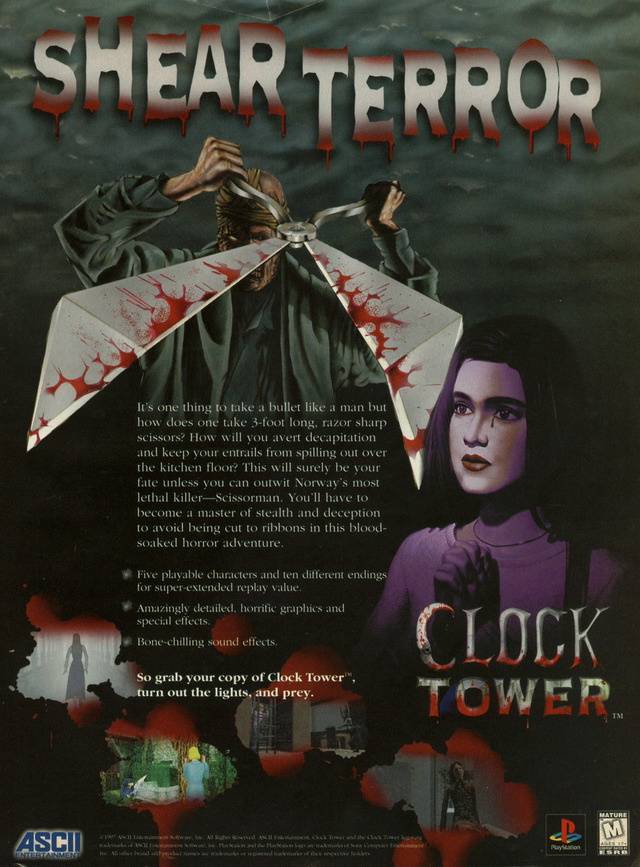 Clock Tower is a survival horror series originally created by Human Entertainment in 1995. The original games had players control a young teenager named Jennifer Simpson while she was being pursued by the supernatural serial killer, the Scissorman. Instead of fighting off enemies with guns, Jennifer could only run and hide from her pursuer. She could only truly fight back when defending herself via the game's "panic button," in which players had to try to push Scissorman off them if he got too close. However, players couldn't do this too often, as this would decrease Jennifer's stamina, which making resisting harder and harder until it couldn't be done anymore.