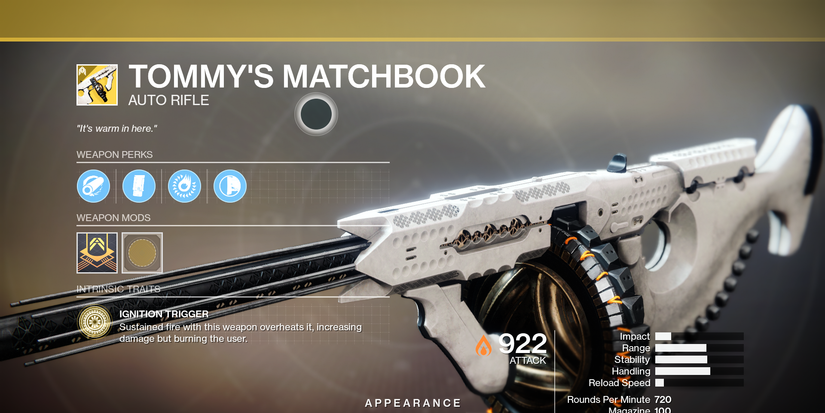 The intrinsic trait of the gun increases damage if the gun overheats, but it will deal a small amount of damage to the user. In average skilled lobbies, the weapon is consistent and surprisingly effective with the additional overheat damage.