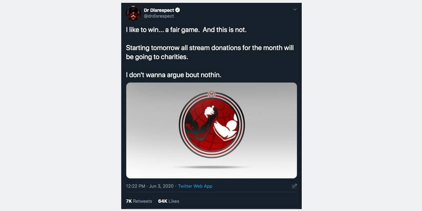 Dr Disrespect tweeted on June 3 that all stream donations he received for the month would be going to charities. He said in his Tweet that he likes to win "a fair game" and then stated that "this" is not a fair game. While it's not certain exactly what he's referring to, he posted a picture along with Tweet of two arms — silhouettes of a black arm and a white arm — holding hands in unity, which alludes to the tensions of racial injustice bubbling to the surface in the United States. Though Dr Disrespect hasn't specified the charities he will be sending his donations, this leads fans to believe that they will be organizations who have been receiving money following the death of George Floyd at the hands of Minneapolis police officers.