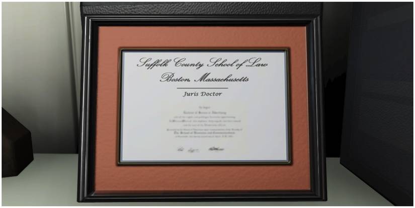 In the Pre-War home of Nate and Nora, a diploma can be found. It is located near the entrance on a shelf, showing Nora also had a potential job. It shows Nora had graduated from Suffolk County School of Law.